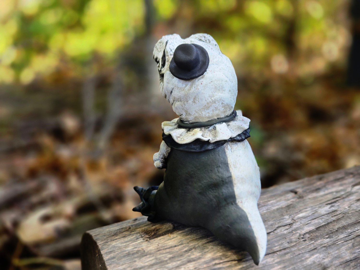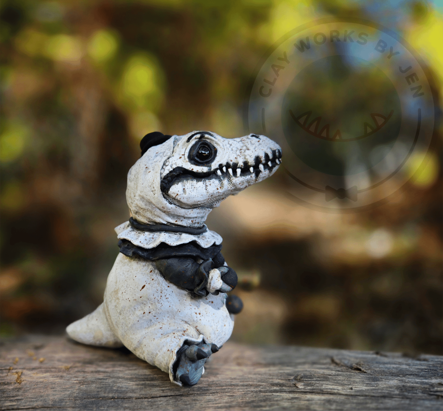 Art is a one of a kind Trick or Treat Dino inspired by Art the clown in the Terrifier movies. He was made with polymer clay, glass eyes, epoxy clay, heat set paint, acrylic paint and LOVE!!!
