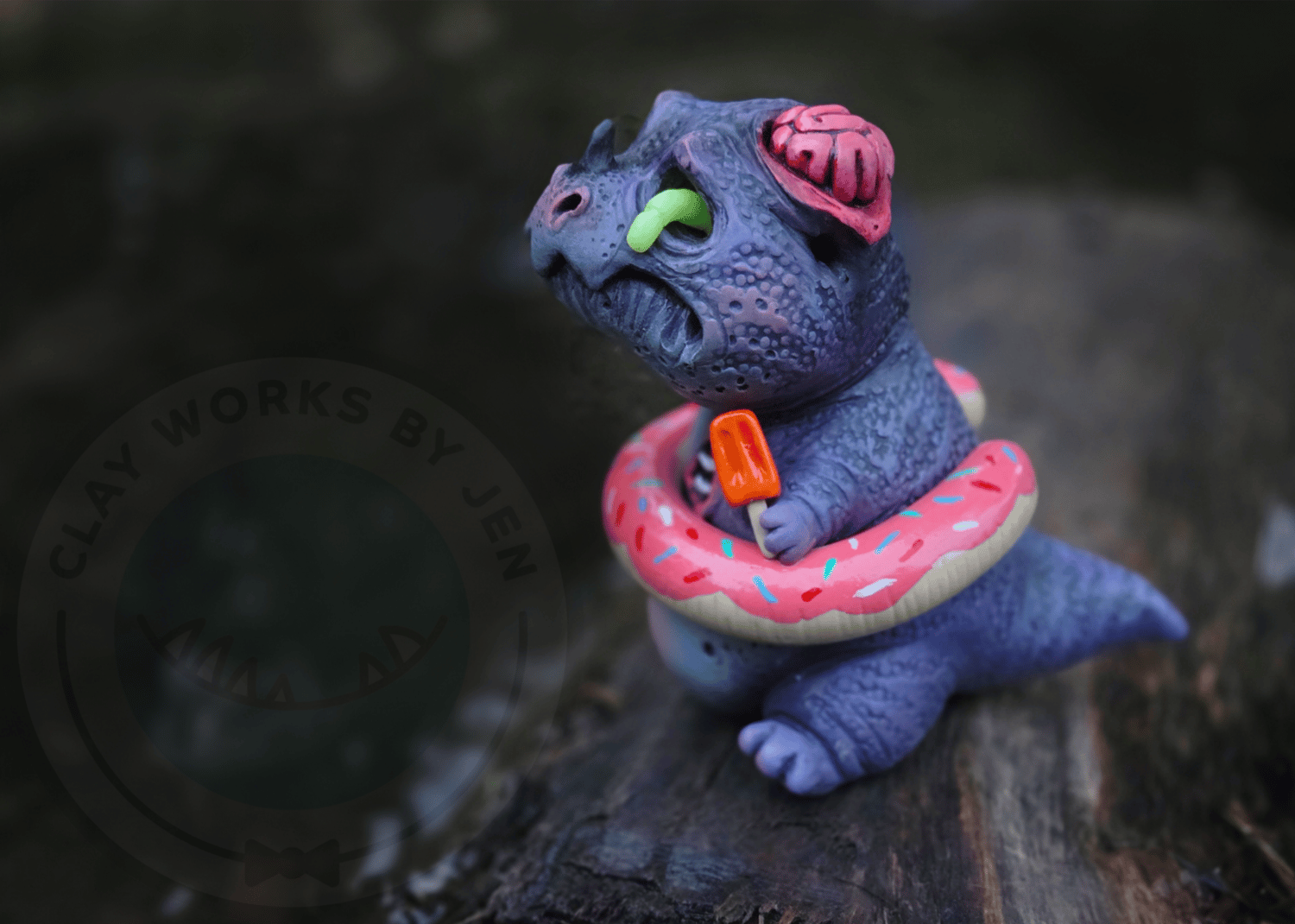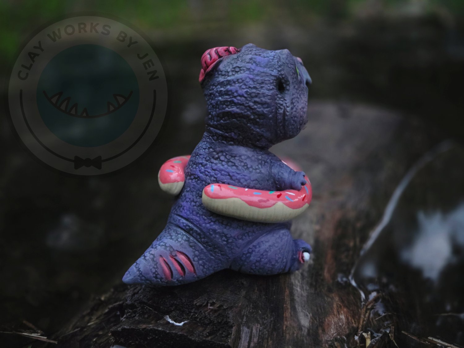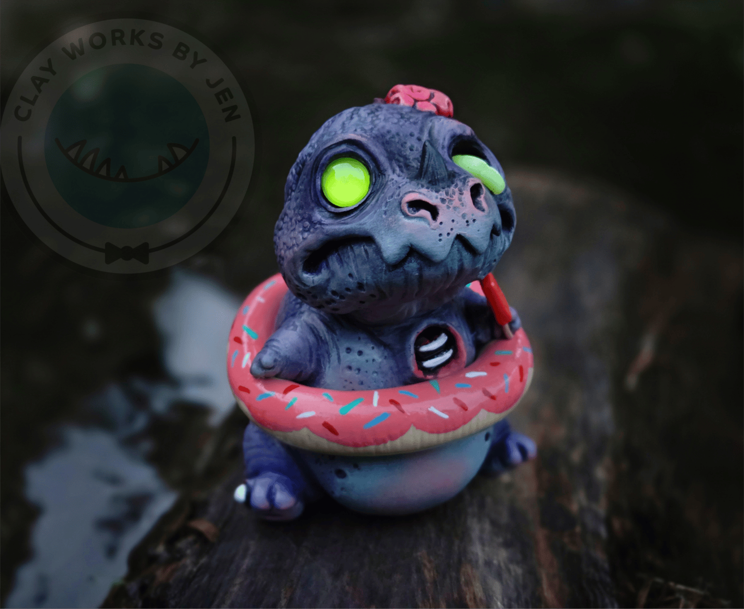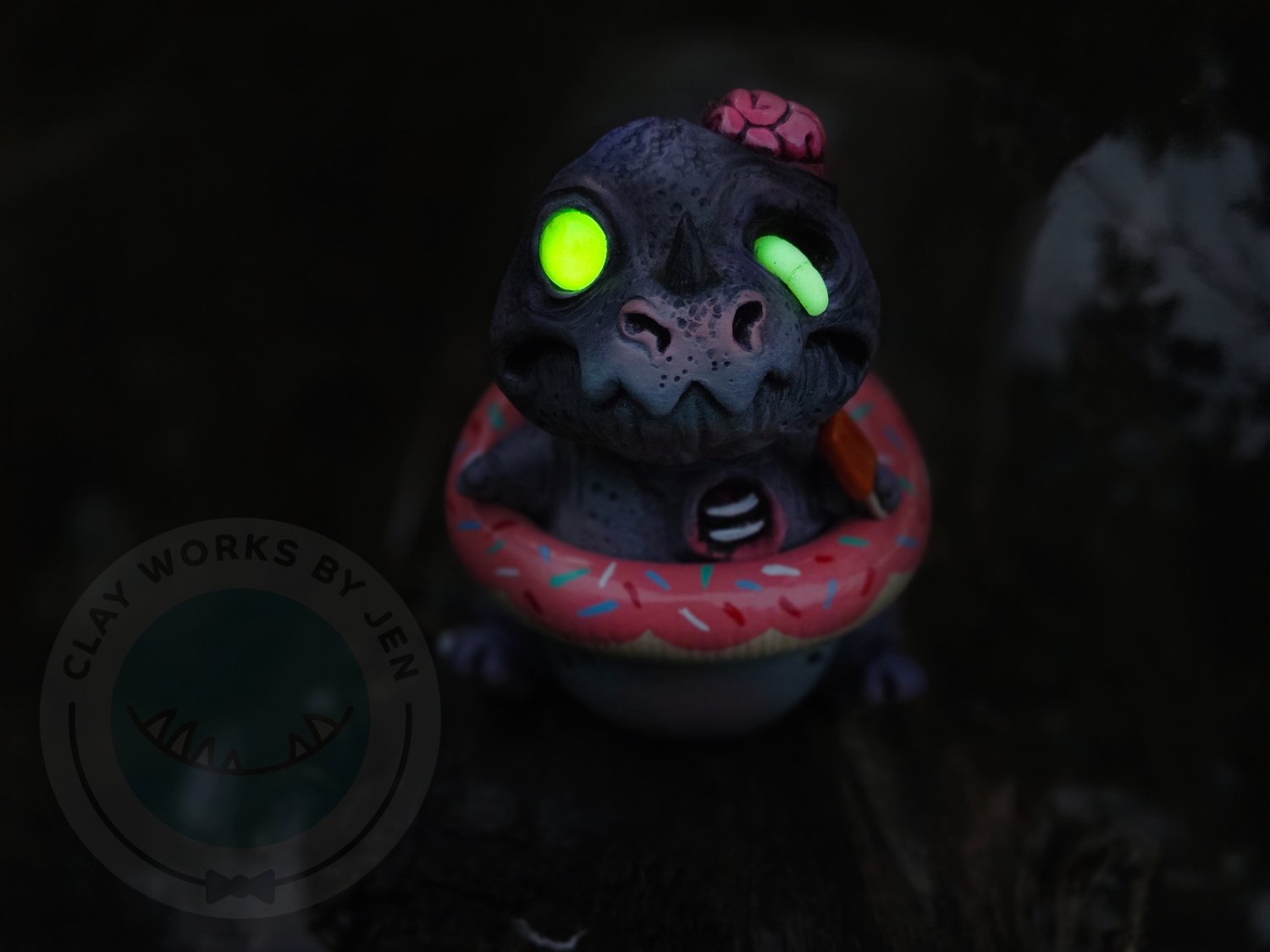 Shriek is a one of a kind zombie dino of my own design. He was made with polymer clay, glass, heat set paint, uv resin, uv glow powder and LOVE!!