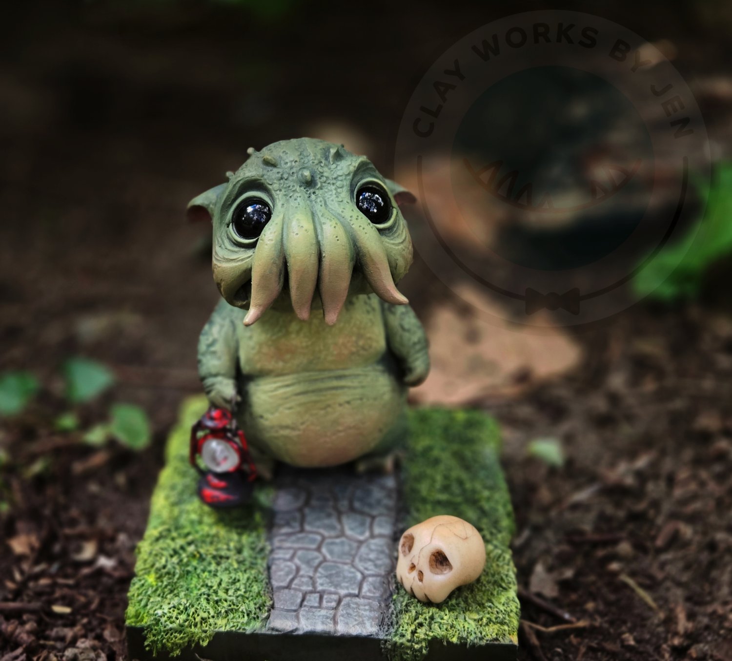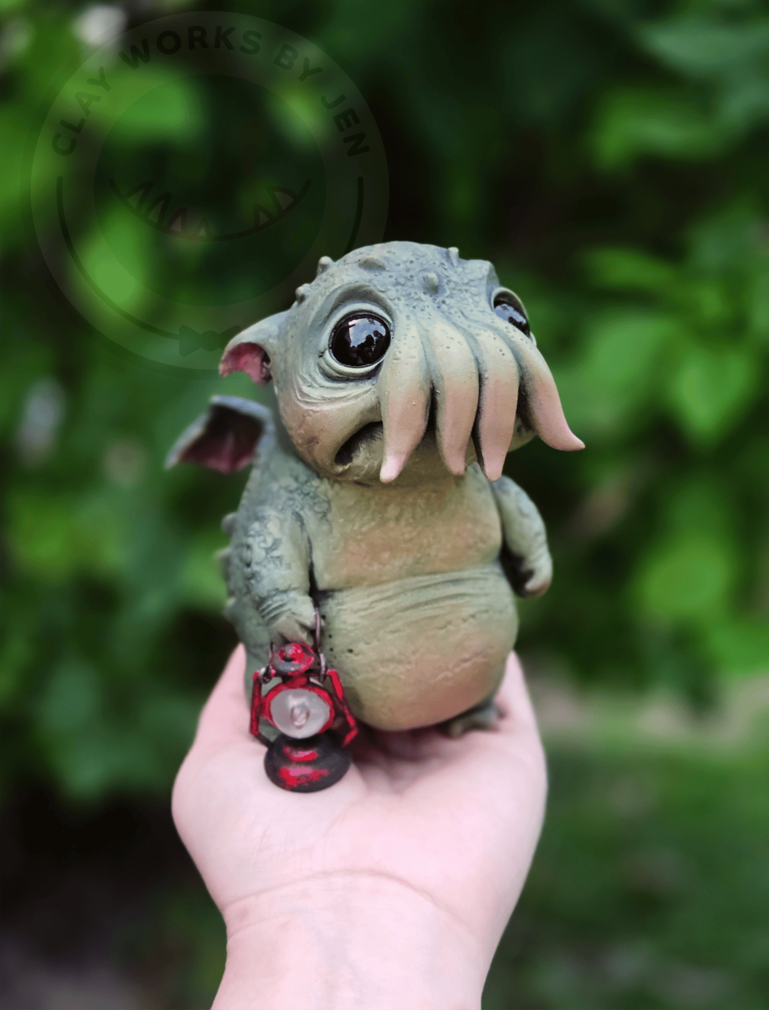 Squish is a one of a kind Cthuhlu of my own design. He was made with polymer clay, glass eyes, heat set paint, miniature lantern, glow pigment powder and LOVE!!!